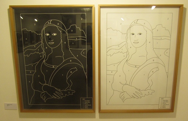 Which is what Roberto Chabet’s contribution here ultimately works from: the refusal to engage with the “Mona Lisa” as extraordinary, and by virtue of that reconfiguring it as the commercial how-to product that teaches anyone how to paint. With the diptych of one white and one black outline of the original Mona, Chabet points to the fact of the Mona’s commercialization and the image’s contingent normalization as something that anyone can paint. At the same time, it speaks of how overrated an image such as this might be.