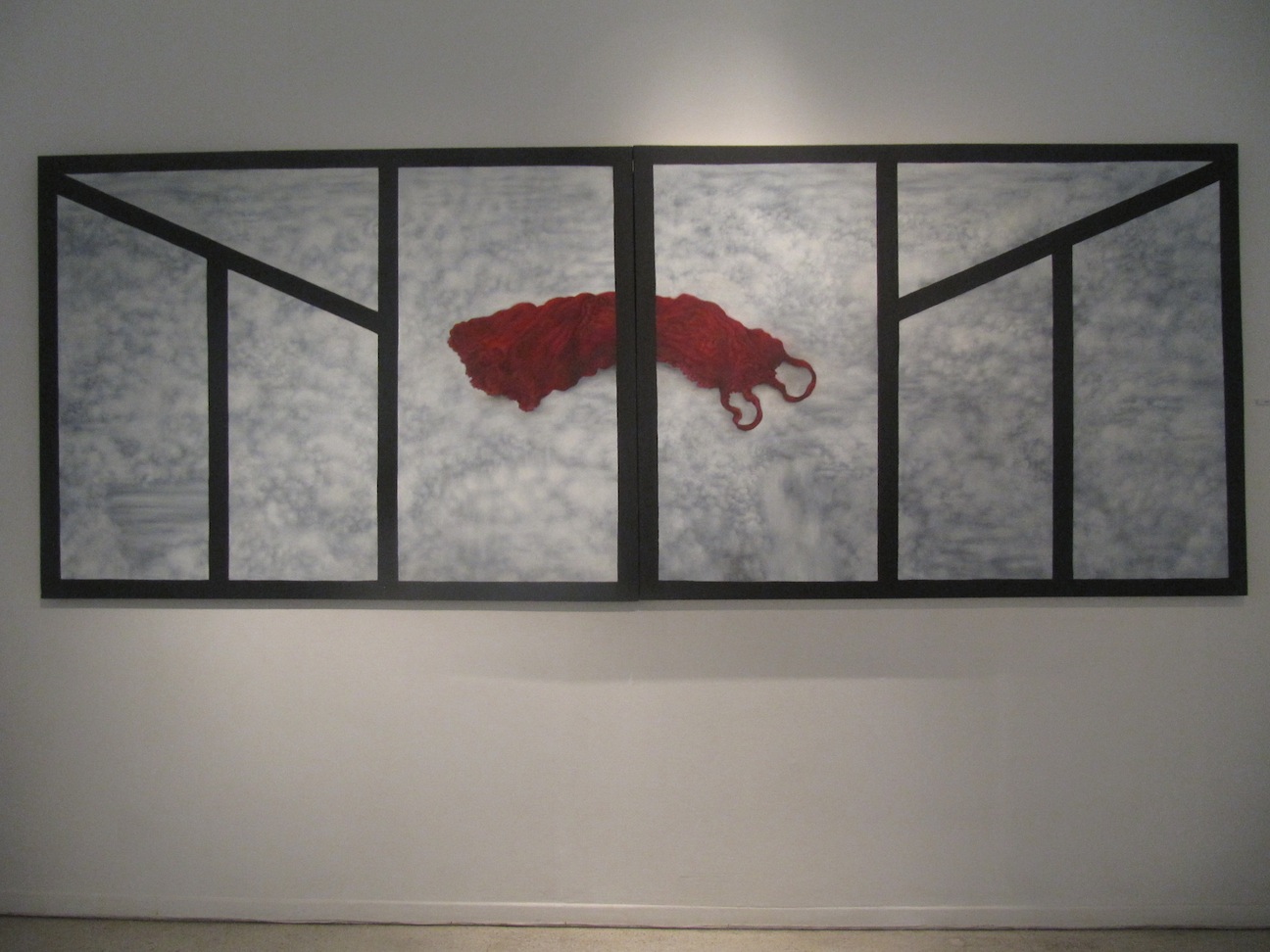 This was also what was in “Lithium,” in fact. There are empty canvasses here, of skies and window views to nothingness, and there are objects, ones that float on the surface, ones that can only be about someone about to leave, if not something that’s falling. The absences are palpable in this set of works, and for some reason it is not so much a missing that is here, but a seeming insistence on taking our longing and loss, and wrapping it around ourselves. It is familiar, it is in these objects and visions of our days, and it is ours.