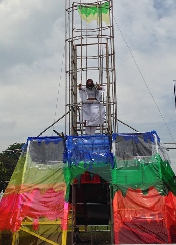 The structure's design mirrors the heroic monument, even if its elements do not promise the same permanence—a basic scaffolding made of metal poles, draped in colored plastic behind which television sets displayed different people answering the question, “Paano ka naging Malaya?”