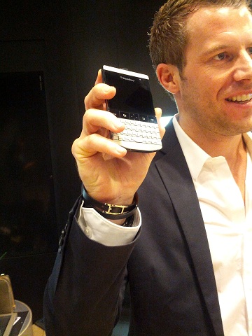 Lars Schmidt holds up the Porsche Design Blackberry.