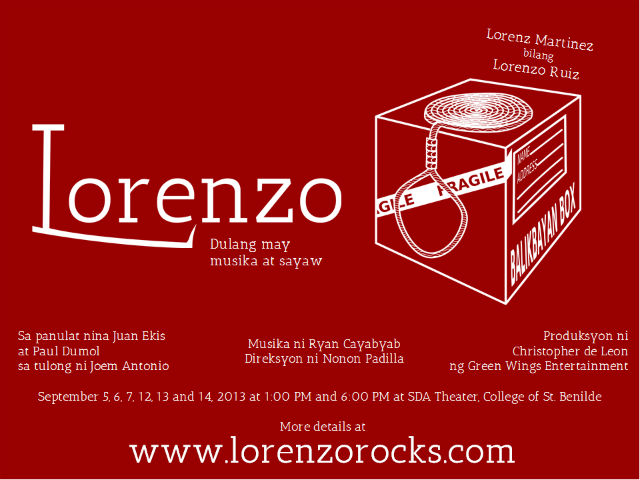 “Lorenzo” was written by Paul A. Dumol and Juan Ekis with Joem Antonio, and was directed by Nonon Padilla. Compositions and musical direction by Ryan Cayabyab. It is a Green Wings Entertainment Network Inc. production, and has shows on September 6 and 7, and September 12-14 at the DLSU-CSB SDA Theater in Malate, Manila.