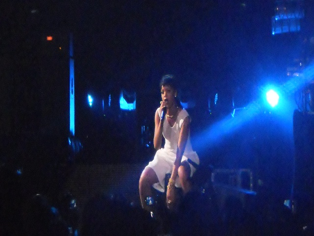 At slightly past 10 p.m., the Caribbean Queen herself emerged to raucous cheering, sporting a starkly white three piece outfit: a basketball uniform made trendy with its laser-cut details and high-cut white sneakers. Sure, she played with the pieces and revealed herself in a fantastic one piece later on, but it was rather understated for someone who was practically half-naked on the cover of “Unapologetic,” her latest album (the songs from which comprised most of her setlist).