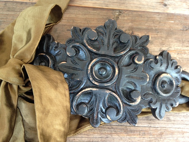 The wood is kiln-dried and finished with water-based varnish, then painted with low-VOC paint (meaning the paint has smaller amounts of the volatile organic compounds—VOCs—found in regular paint). The buckle is about 4 to 6 inches in width, with handles on each side to which the sash can be tied. Each belt comes with two sashes, measuring around 90 inches. And each buckle promises to have a curve that molds to a woman’s body.