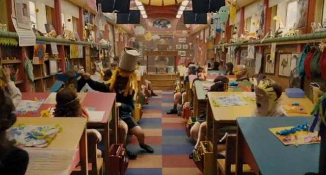The characters progress through the train, and this train is really a triumph of imagination and production design. It's like Noah's Ark but with social stratification. There are a lot of interesting statements here about culture, class, and education, just from the way that the visuals are juxtaposed against each other. One of the joys in this film is going from one kind of train car to the next. We open on the terrible circumstances of the tail, which feel like post-Cold War: dark, metallic and dingy, and we think this is all that's left of the world, this misery. And then we are revealed the luxury and opulence of other train cars—and in one of the best and most jarring and imaginatively messed up sequences, a kiddie classroom with Alison Pill doing a true believer/zealot teaching pitch inculcating the belief system to these annoying privileged kids.
