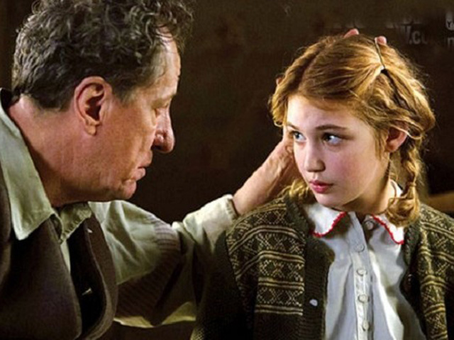 Our introduction to Liesel sees the wide-eyed waif and her younger brother on their way to meet their foster parents. As narrated to the audience by no less than Death himself (“The Queen’s” Roger Allam, sounding uncannily like “Harry Potter’s” Michael Gambon), Liesel suffers a decidedly Dickensian tragedy in the form of her brother passing away en route. A quick burial and one purloined book later, Leisel arrives on Heaven St., where she meets the Hubermans, comprised of kindly sign painter Hans (Academy Award winner Geoffrey Rush) and the stern Rosa (Emily Block, TV’s “Downton Abbey”).