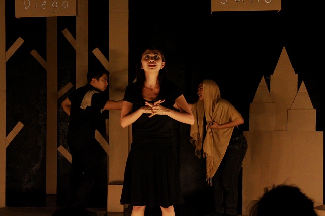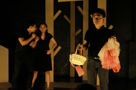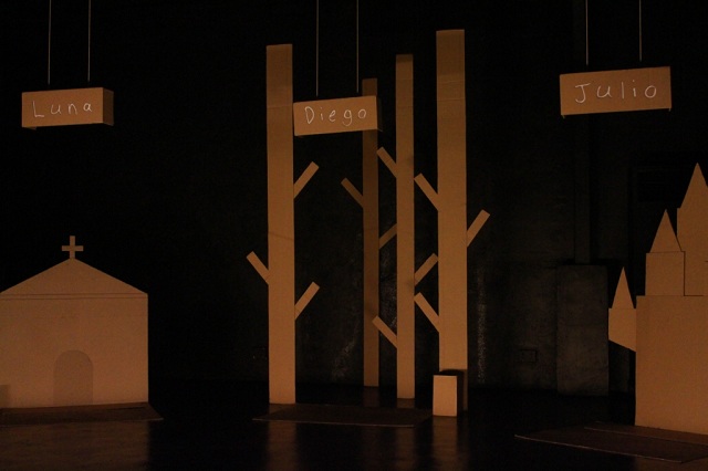 The play opens with the trio reciting lines from grim fairy tales, a foreboding of the dark tone of the drama. The recitation of the lines happens in the especially designated individual spaces prominently marked “Julio,” “Luna,” and “Diego.”