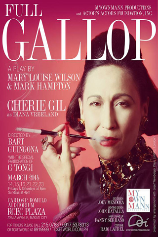 "Full Gallop" is a one-woman play written by Louise Wilson and Mark Hampton about fashion editor and icon Diana Vreeland, portrayed by actress Cherie Gil. Show dates are on March 21 and 22 at the Carlos P. Romulo auditorium in RCBC Plaza, Makati City.