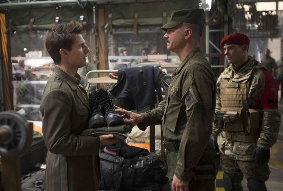 William Cage (Tom Cruise) meets the colorful Master Sergeant Farrell Bartolome (Bill Paxton).