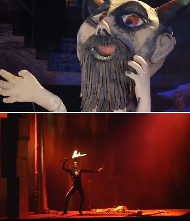 Huge papier-mache-style masks of a devil and a skull were paraded down the aisles within minutes of the curtain going up and they remained suspended from boxes on either side of the stage for the duration, emphasizing the carnival tone.