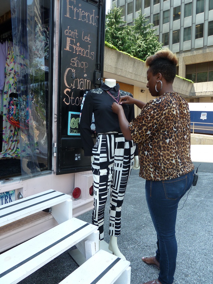 Lia Lee, owner of the Street Boutique fashion truck, arranges a mannequin while waiting for customers in Crystal City, Virginia, on May 22, 2014, near Washington, DC. Street Boutique is part of a growing number of "rolling" boutiques in the US. AFP PHOTO/Fabienne Faur