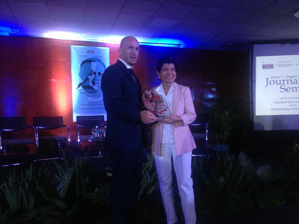 Cheche Lazaro receives her plaque as the 2014 Marshall McLuhan fellow from the Canadian Embassy's Political and Economic Relations Counsellor James Christoff. Xianne Arcangel