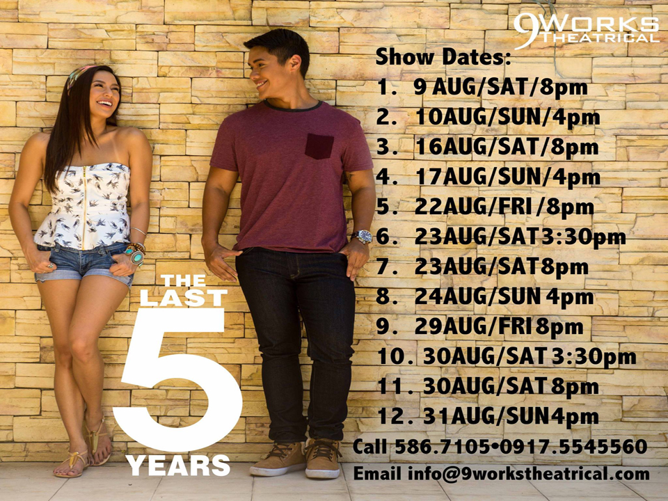 The Last Five Years runs all weekends of August at the Carlos P. Romulo Auditorium, RCBC Plaza, Makati City. Check 9 Works Theatrical's site for more details