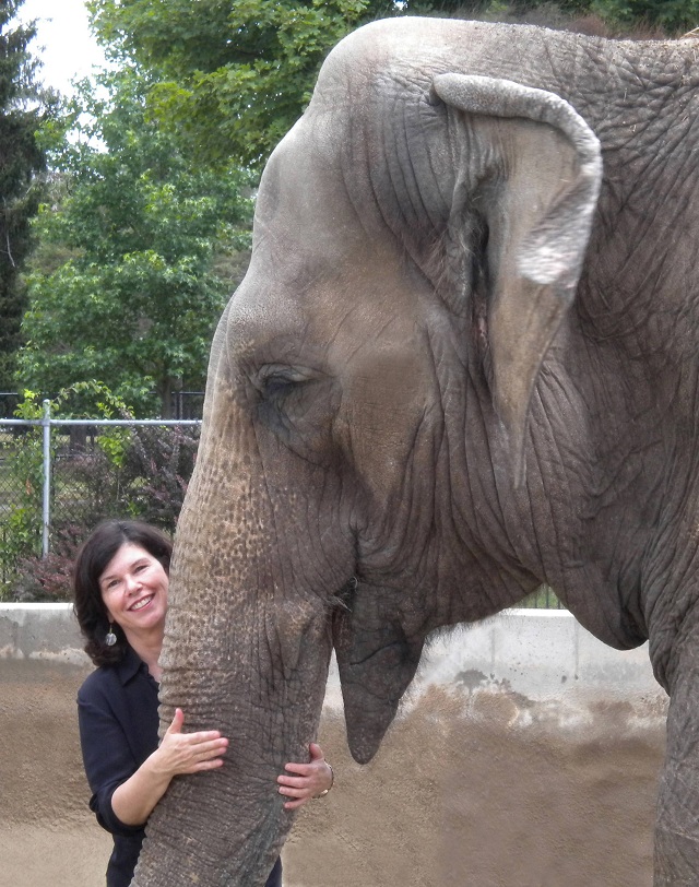 American writer Vicki Constantine Croke poses with Emily the elephant at Buttonwood Park Zoo in New Bedford, Massachusetts in this undated handout picture. Croke has a special place in her heart for animals and their magical connection and friendship with humans, which inspired her latest book, "Elephant Company." REUTERS/Christen Goguen/Handout via Reuters