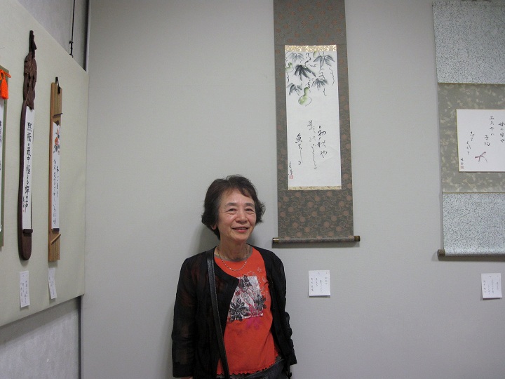 Miyoo Aoki poses in front of one of her haiku, framed along with other works on their club wall.