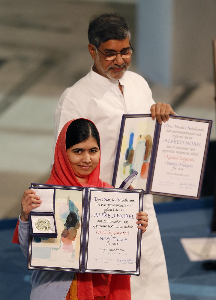 Nobel Peace Prize laureates Malala Yousafzai and Kailash Satyarthi pose with their medals and diplomas during the Nobel Peace Prize awards ceremony at the City Hall in Oslo December 10, 2014. Yousafzai, who was shot in the head by the Taliban in 2012 for advocating girls' right to education, has won the prize along with Indian campaigner against child trafficking and labor Satyarthi. REUTERS/Suzanne Plunkett