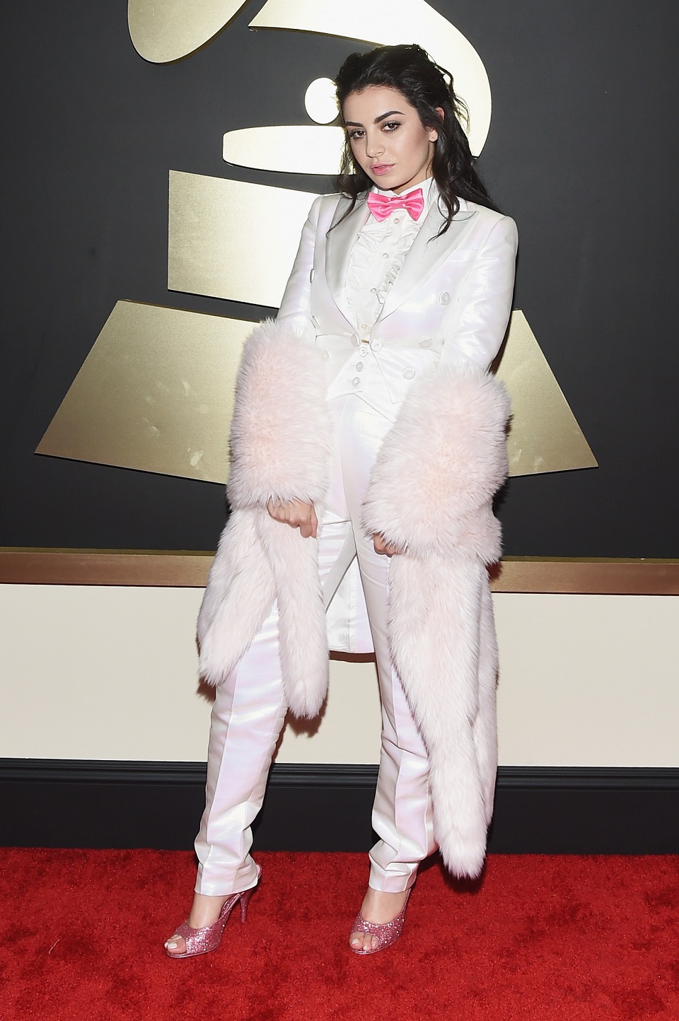 Britain's Charli XCX—perhaps best known for singing the hook on Iggy Azalea's ubiquitous hit "Fancy"—also worked the white suit look from Moschino, but gave it a girly twist with a pink bow tie.
