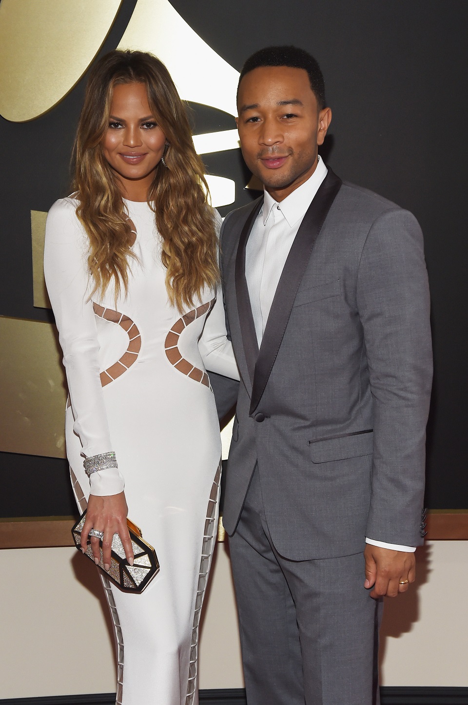 Model Chrissy Teigen showed up in a white Gucci gown with snaky cut-outs, while husband John Legend when for a no-tie gray Dolce & Gabbana suit. Larry Busacca/Getty Images for NARAS/AFP