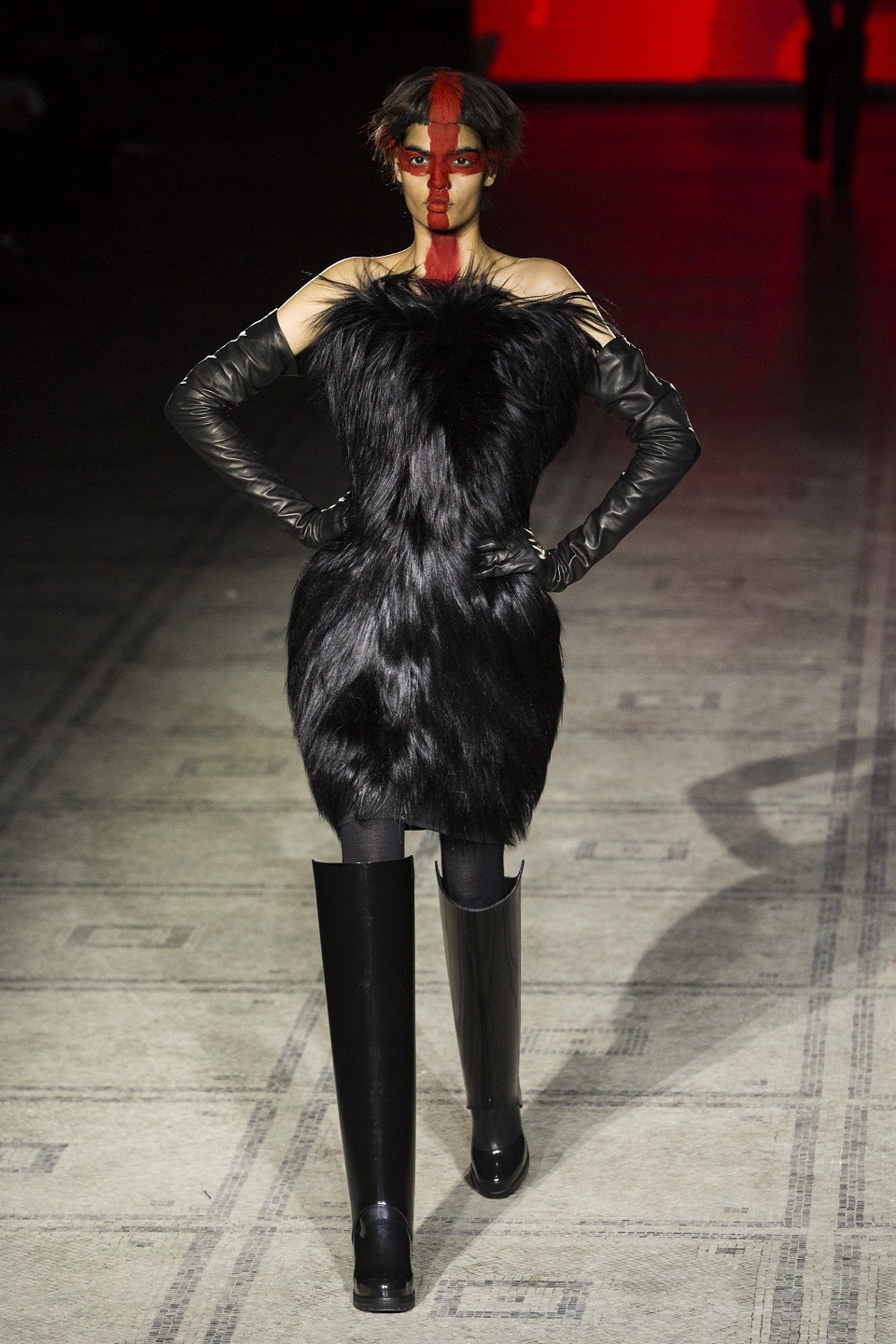 To a soundtrack of chanting crowds, the helmeted models strode down the runway in black leather breastplates worn over floor-trailing skirts with nipped-in waists or dresses adorned with black spikes that shimmered like chain mail—or dragon scales.