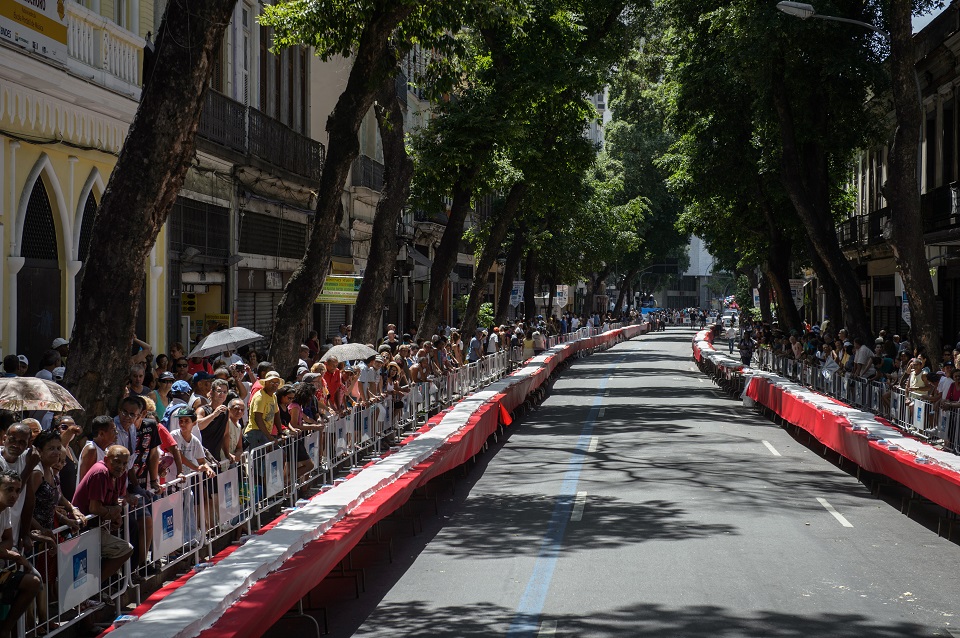 The enormous sweet was the centerpiece of the city's birthday celebrations, and was served up on a long table reaching down Carioca Street in the heart of the city.