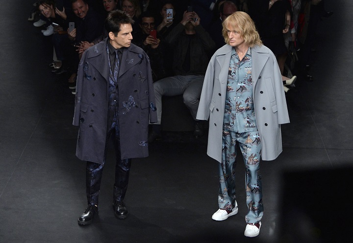 Actors Ben Stiller and Owen Wilson present creations for Valentino as their 'Zoolander' characters Derek Zoolander and Hansel during the 2015-2016 fall/winter ready-to-wear collection fashion show on March 10, 2015 in Paris. AFP PHOTO/Miguel Medina