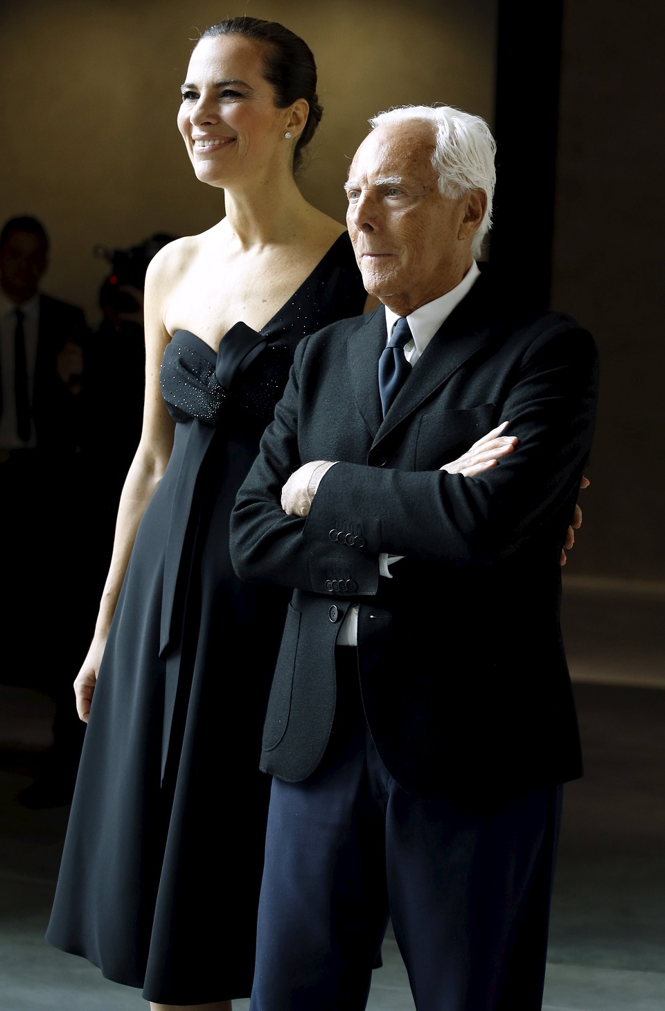 Italian designer Giorgio Armani poses with his niece Roberta during a photo call to mark the opening of the Expo 2015 in Milan, April 30, 2015. REUTERS/Alessandro Garofalo