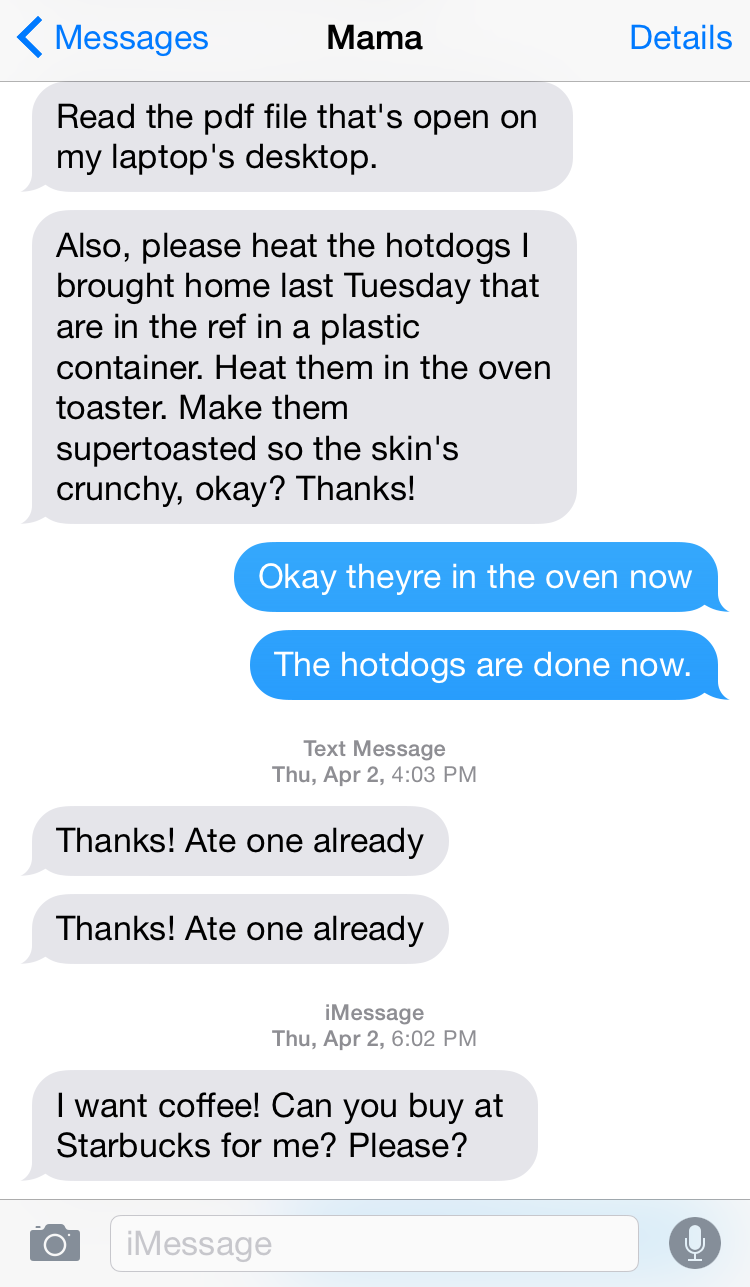 Though she may not be as well-versed in the workings of online messaging and posting, my mom loves to text. Our mobile phones have become the new intercom system.