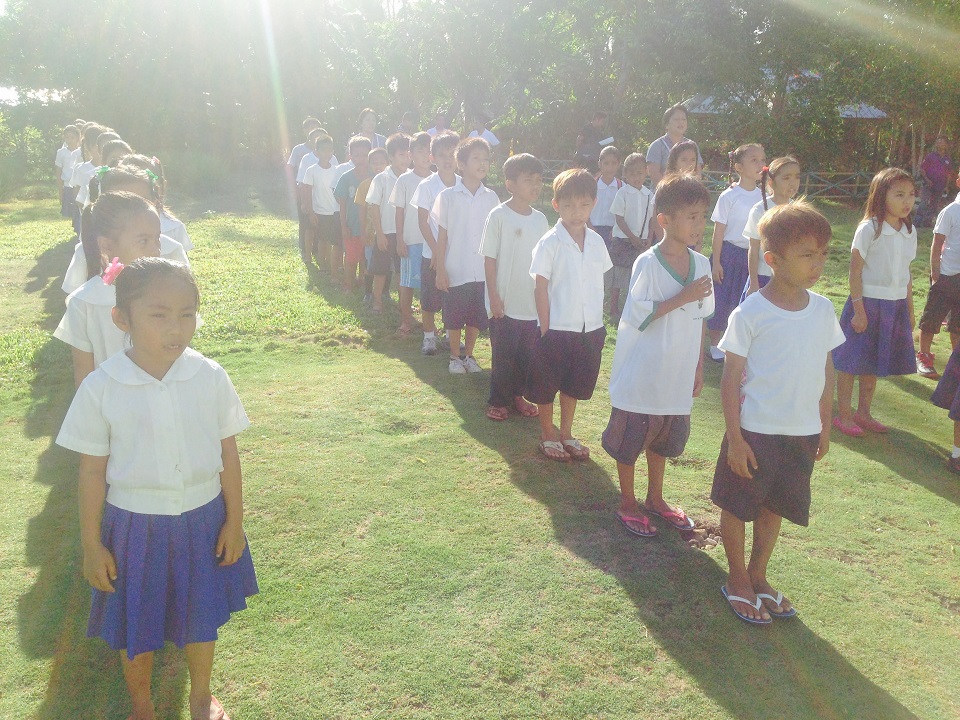 Pupils at the Konel Elementary School on Balut Island, Sarangani during the flag ceremony. Lolita Makaminang and I were situated behind them, under an acacia tree.