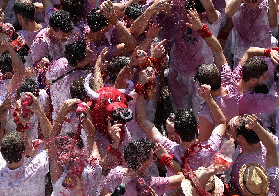 Revelers spray wine as they enjoy before the 'Chupinazo' (start rocket) launch that marks the kickoff at noon sharp of the San Fermin Festival, in front of the Town Hall of Pamplona, northern Spain, on July 6, 2015. A red-and-white sea of revelers soaked each other with wine in a packed Pamplona square today to start off Spain's most famous fiesta, the San Fermin bull-running festival. AFP PHOTO/Miguel Riopa