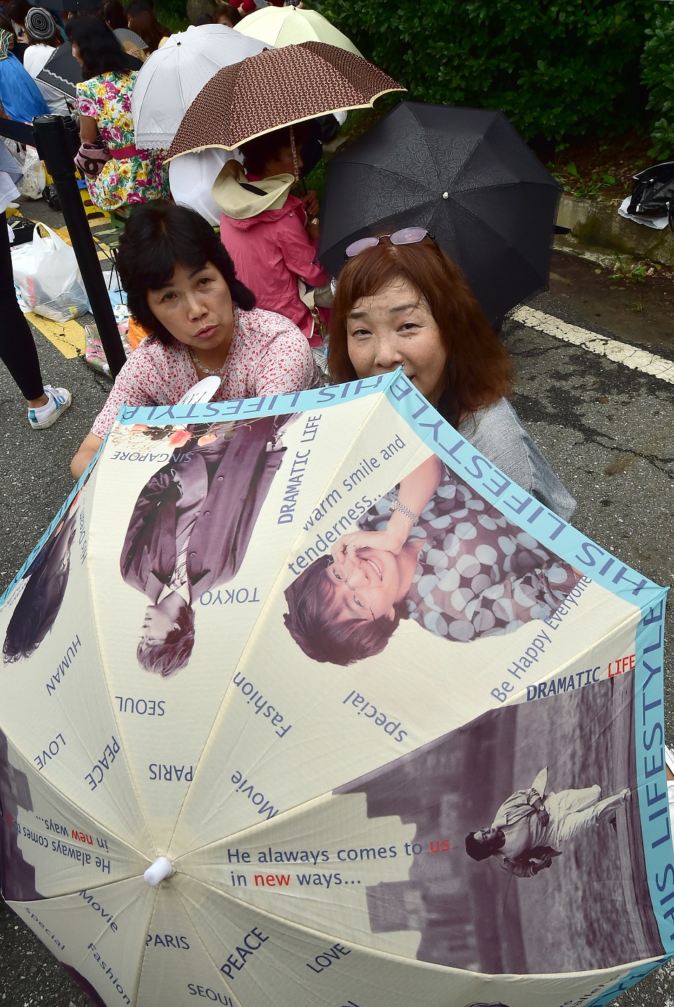Japanese fans of South Korean actor Bae Yong-Joon hold an umbrella showing pictures of Bae as they wait on a side of the road leading to the wedding hall to get a glimpse of their favorite star before Bae's wedding ceremony at a hotel in Seoul on July 27, 2015. AFP PHOTO/Jung Yeon-Je