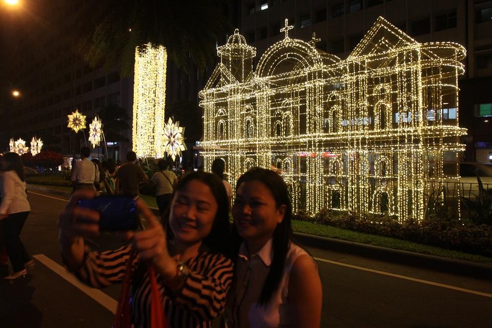 Passersby take selfies with the lights, in the shape of stars and churches, on Ayala Avenue.