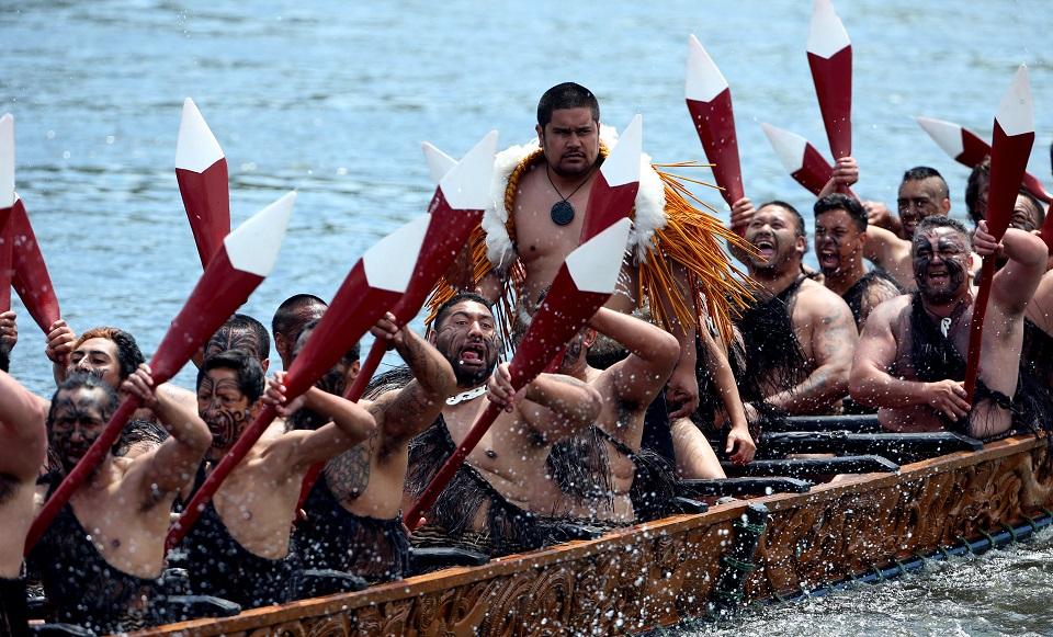 Charles wore a kiwi feather cloak as five ornately carved war canoes, or waka, paraded past on the Waikato River, each carrying about 30 tattooed warriors who raised their paddles in salute, singing Maori chants as they went by.