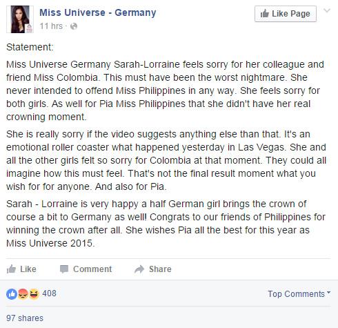 "Miss Universe-Germany Sarah-Lorraine feels sorry for her colleague and friend Miss Colombia. This must have been the worst nightmare. She never intended to offend Miss Philippines in any way. She feels sorry for both girls," the statement read.