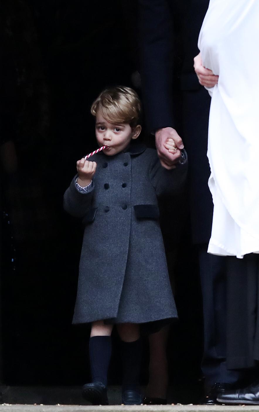 Britain's Prince George eats a sweet after attending a Christmas Day service at St Mark's Church in Englefield on December 25, 2016. Andrew Matthews/POOL/AFP