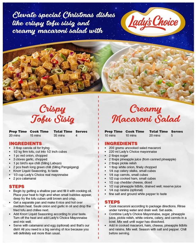 Of course, a Pinoy Christmas feast isn’t complete without the iconic creamy macaroni salad—made best with Lady’s Choice Real Mayonnaise. This year, Lady’s Choice invites elevated mayonnaise dishes to your kitchen with Crispy Tofu Sisig and Creamy Macaroni Salad.