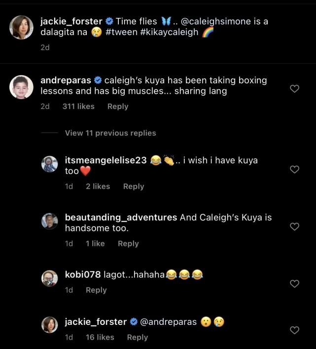 Jackie shared a short clip of her beautiful daughter Caleigh last week, and Andre left a comment saying her “kuya has been taking boxing lessons and has big muscles… Sharing lang.”