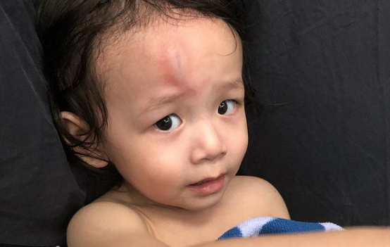 Shared a photo of Salem with a booboo on his forehead, Chynna wrote, "Little accidents happen at home with a baby that has too much energy. He miscalculated & ran straight into the door jamb. Buti na lang rounded!"