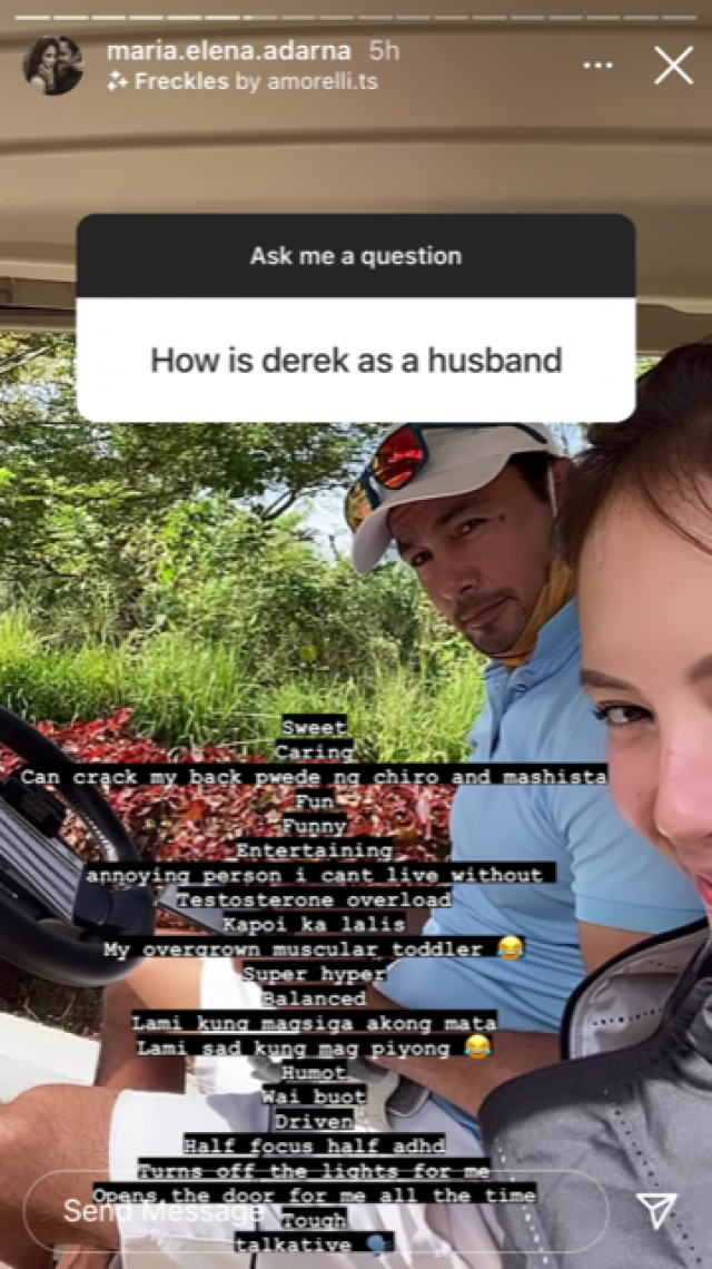 On her Instagram stories Thursday, Ellen Adarna answered questions from fans, one of whom asked how Derek Ramsay was as a husband.