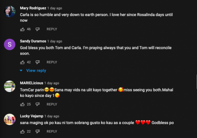 Several “TomCar” fans left messages for the couple in the comments of Carla’s vlog, many of them expressing hope the couple are doing okay. — LA, GMA News