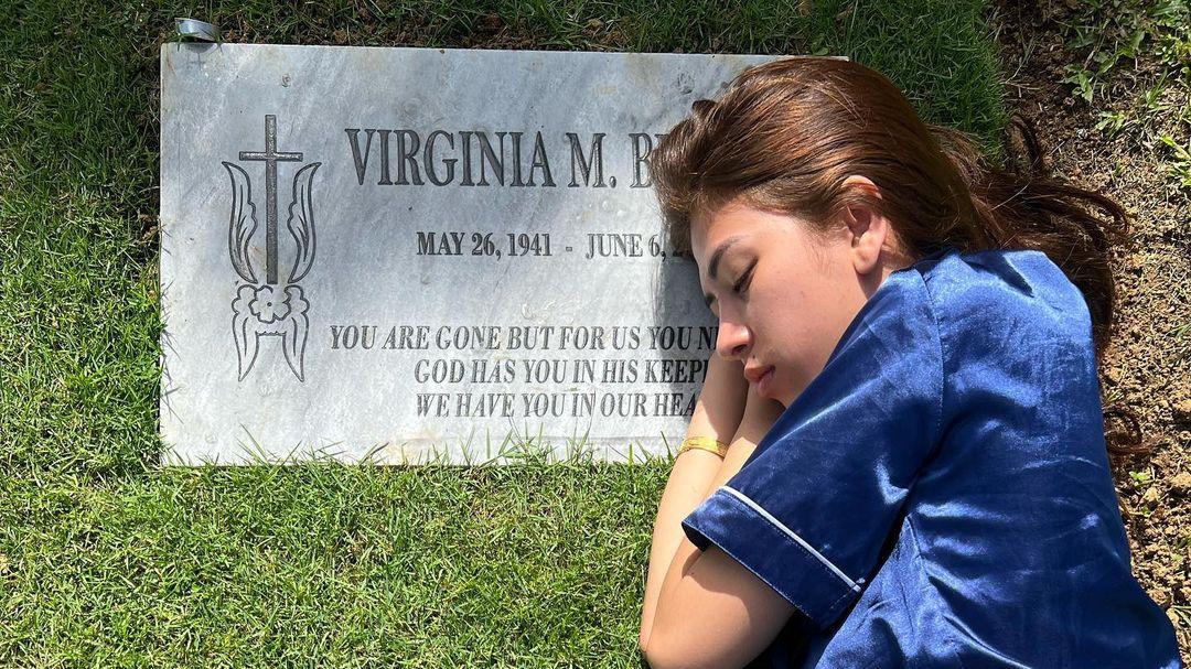 On Instagram, the beauty queen and comedienne shared photos of herself visiting her Nanay Bireng's grave. She's lying on the grass wearing silk pajamas.