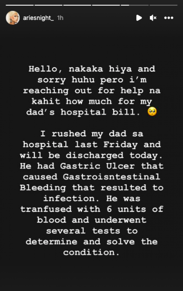 “Nakakahiya and sorry pero I’m reaching out for help, kahit how much for my dad’s hospital," Aries wrote.