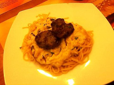 A more elegant and less messy choice for the ladies: white pasta with burger patties.