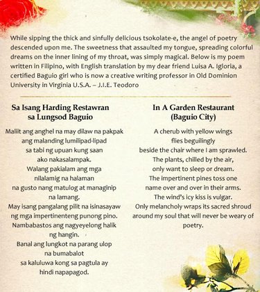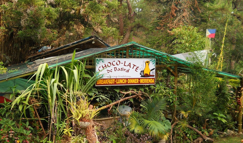 How could I forget the restaurantâs name? Choco-laté de Batirol. It was immediately carved in my mind. It was an instant obsession - I couldnât stop thinking of it. I told myself, I have to go there. The place reminded me of my favorite restaurant in Puerto Princesa Cityâthe Kamarikutan Kape at Galeri owned by my artist-friend Dinggot Conde-Prieto and her goddess mother Nanay Dayang Macasaet. These two wonderful women divide their time between Puerto and Baguio. Kamarikutan is a lot bigger but the flowers, art works, and overall ambiance is almost the same. Puerto Princesa is, of course, warm and humid most of the time while Baguio is sensually cold. On a Wednesday afternoon, during the free day of the workshop, I did not go with my friends who went to Session Road. Instead, I hiked down to Choco-laté de Batirol after a short siesta. The tall pine trees standing straight were almost impersonal. I walked slowly, savoring the green and cool surroundings. I passed by the golf course and stopped to observe three rich-looking men playing the game. Again I wondered, what pleasure do people get from playing golf? I had asked this question during the merienda break on the first day of the workshop. Below the venue is a tee hole, and I was looking at the men playing and I thought they were as bored as I was by their game. I asked the question to no one in particular. Somebody answered, âPerhaps you need to have a Swiss account to appreciate the game?" I stopped asking, and thought of my ATM account that had a balance of less than P100 most of the time. When I reached the restaurant, I discovered that it is located in the section of Camp John Hay called Igorot Garden. The area is rather shabby, with a statue of an Igorot woman in the middle. The name of the restaurant is lovingly carved on wood with designs of flowers, the pitcher for mixing the traditional tsokolate-e and the batirol, a wooden mixer used manually.