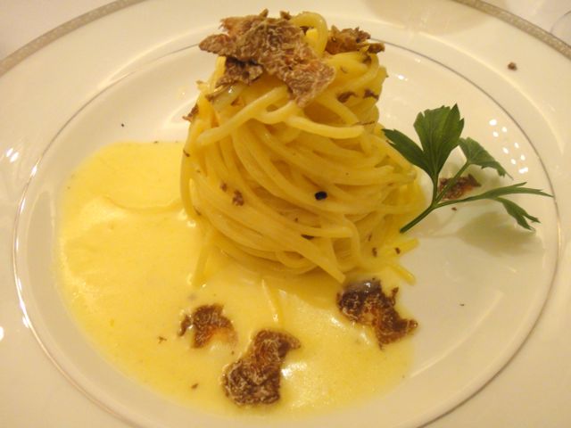 Truffles and pasta And so it was truffles and pasta day for us. “Pasta with truffles is like a king with his queen,” Spinosi said. First, a demonstration. Together with Chef Daniele and Makati Shangri-La's Executive Chef Franco Brodini, he showed us how Spinosini pasta should be cooked. A pot of water was fired up at the stove in front of us, and in went lots of salt. Next, the pasta was slid carefully from the box. While it was cooking, the chefs lit another stove, putting butter on a pan. Garlic was added along with white truffles from Angellozzi, white wine, olive oil, and shavings of Parmigiano-Reggiano. By this time the pasta was cooked; it was transferred to the pan, and a ladle of pasta water was added. In a few minutes—about four—it was done.