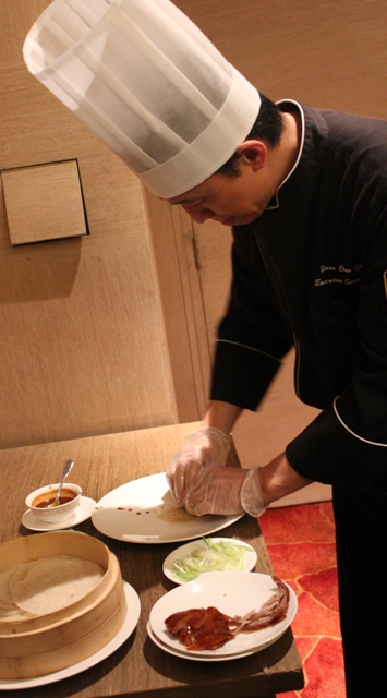 From Beijing, Chef Yuan Chao Ying is in Manila to share his special method of preparing and cooking the iconic Chinese dish. Chef Yuan’s first stop is Makati Shangrila’s Shang Palace. As the restaurant's name implies, it has looks every bit fit for an emperor and royal guests. The crystals that hang from the ceilings, deep red carpets, and golden walls immediately call to mind the grandeur of ancient Chinese dynasties. Its ambiance added to expectations of a grand royal banquet served by Yuan, who had worked at the Quanjude, a Beijing
