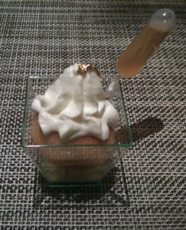 Maybe it was the lone dessert on the tray she was holding, or the fact that I spied a little balloon-like thing on it that made me motion for the roving lady server, so chic in her cream-and-brown Rajo Laurel-designed uniform, to come to our table yesterday. “Would you like some?” she asked.