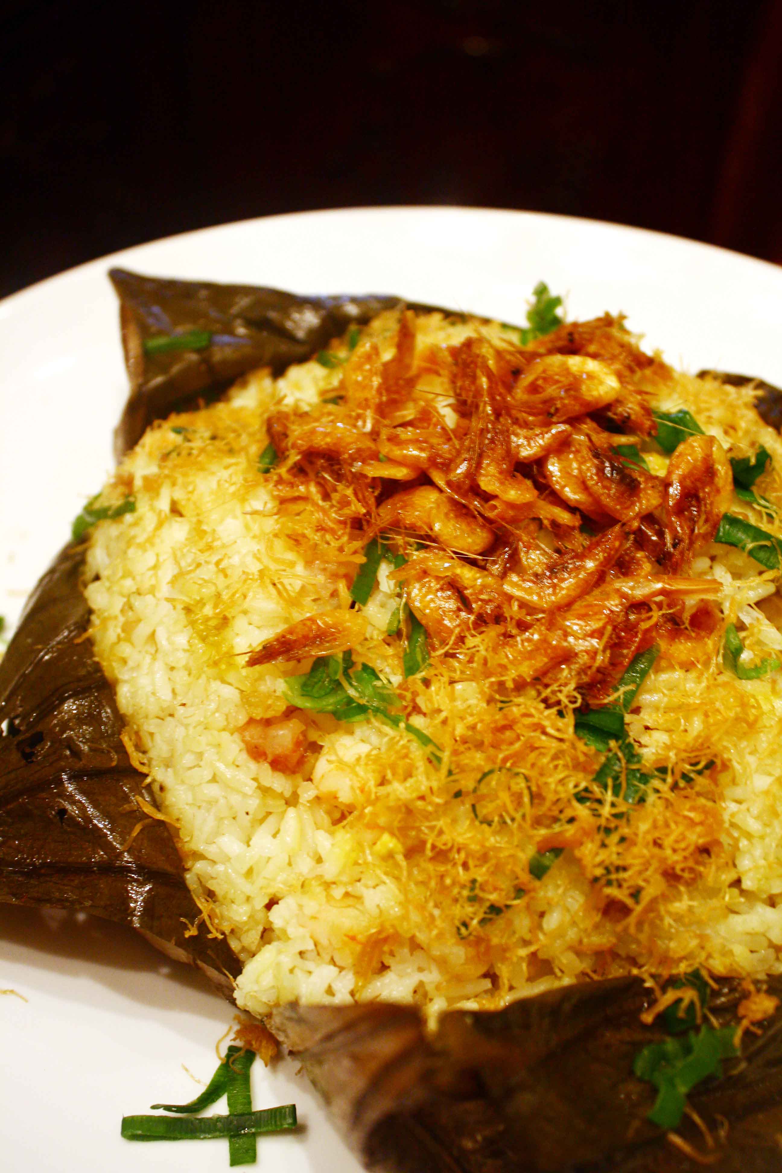 Fragrant rice with dried seafood treasure in lotus leaf .