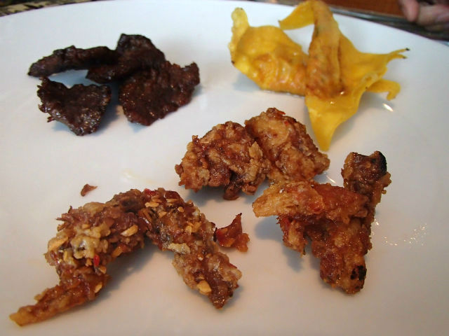 Appetizers of stir-fried soft shell crab with chili salt, fried sun-dried marinated beef served with chili sauce, and stuffed wonton Carmela Lapeña