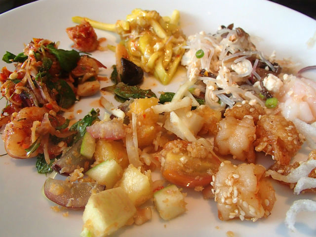 An assortment of salad dishes, including Som Tam Polamai (spicy assorted fruit salad) and Yaam Mamuang Nuea Poo (spicy mango salad with crab meat) Carmela Lapeña
