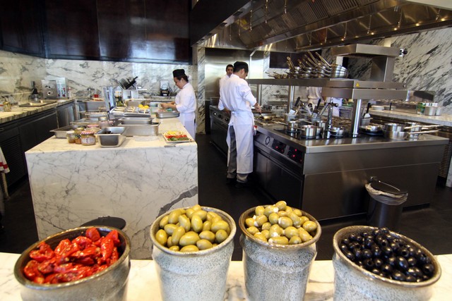 Filipino staff preparing food at a live-cooking station in Fresh. Solaire employs 4,600 full-time staff, of which over 400 are former overseas Filipino workers from first-class casinos the world over. Photos by Danny Pata
