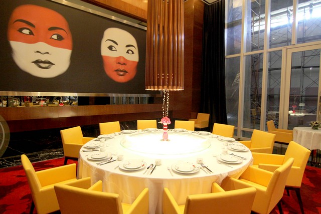 Works by Filipino artists—like this red, white and black painting in Chinese cuisine restaurant Red Lantern—are hung on walls in Solaire.